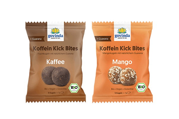 Unsere neuen Koffein Kick Bites sind der ideale Bio Energy Snack für alle, die unterwegs schnell neue Energie brauchen. Die praktischen Energy Balls mit Koffein liefern pro Portion (5 Bites) 80 mg Koffein – vergleichbar mit einer Tasse Espresso (60 ml). Bio, vegan, glutenfrei und ohne raffinierten Zucker sind sie eine bewusste Alternative zu Energy Drinks, Schokoriegeln oder Coffee-to-go.